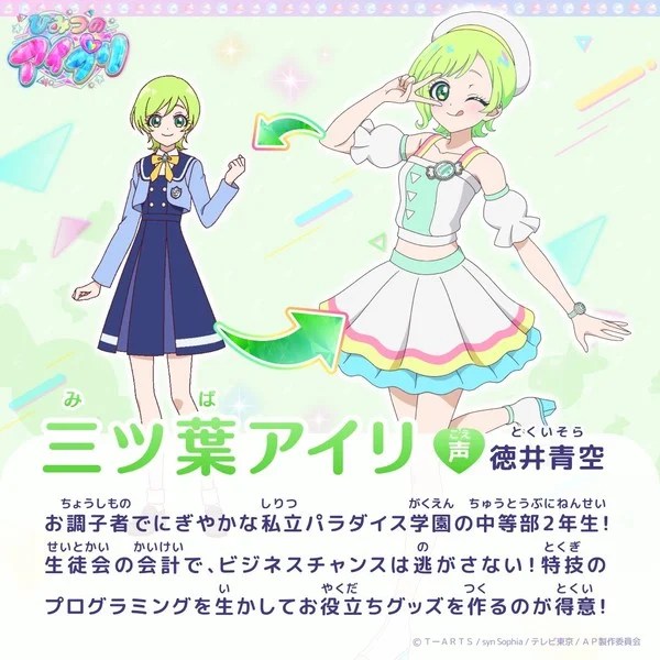 Sora Tokui as Airi Mitsuba, a lively and energetic second-year middle school student at Paradise Academy, and student body treasurer