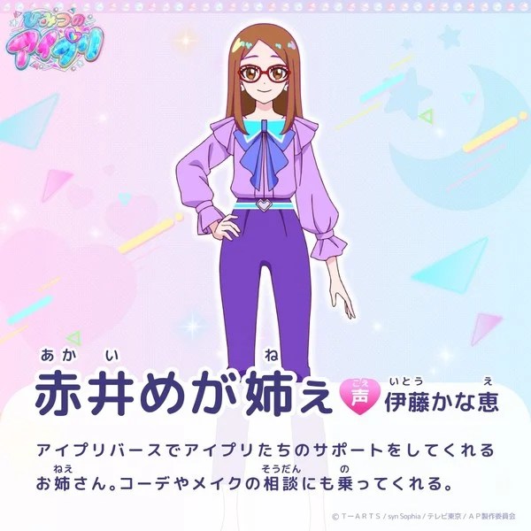 Franchise veteran Kanae Itō as Meganee Akai, a sisterly figure who assists AiPri girls in AiPriVerse