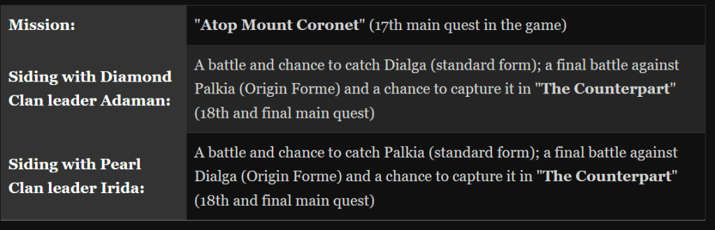 Opting for Adaman means encountering and catching Dialga first atop Mount Coronet. This sets up a climactic battle against Palkia in its Origin Forme as the final boss, immediately followed by capturing it. Conversely, choosing Irida results in encountering and catching Palkia first, leading to a showdown against Dialga in its Origin Forme as the ultimate challenge.