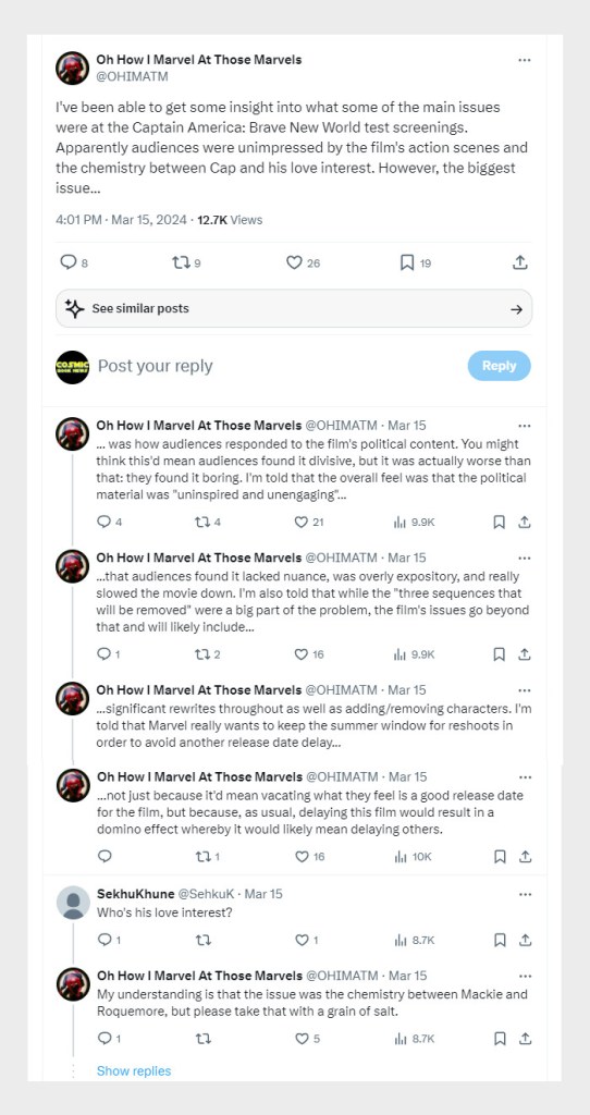 I’ve been able to get some insight into what some of the main issues were at the Captain America: Brave New World test screenings. Apparently audiences were unimpressed by the film’s action scenes and the chemistry between Cap and his love interest. However, the biggest issue…