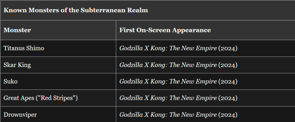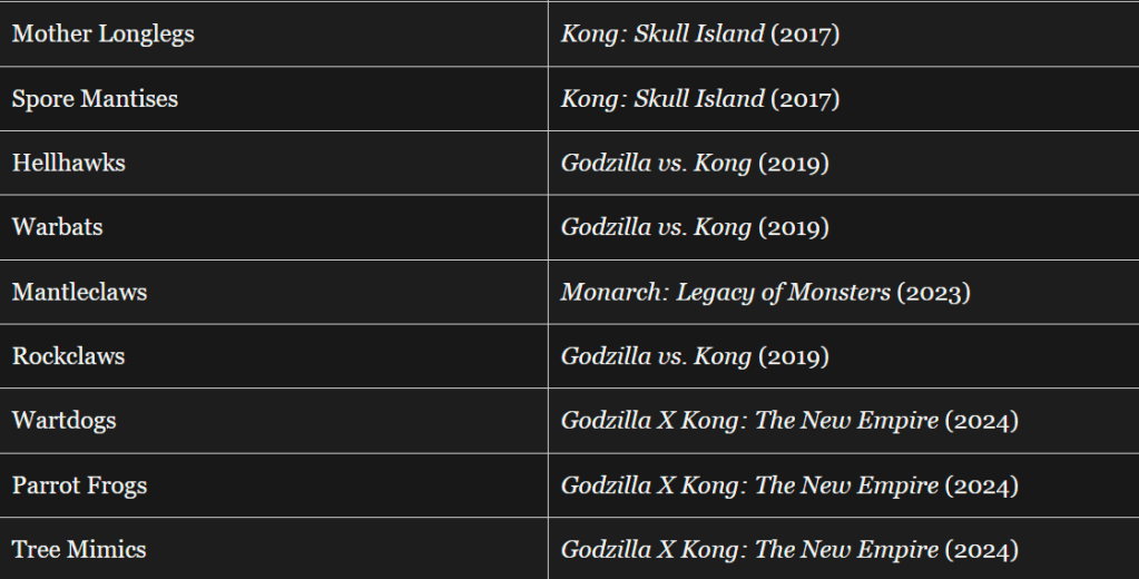 The Hollow Earth presents a twisted reflection of Earth’s surface ecosystems, populated by creatures of varying sizes and dangers. Kong is one of the largest daikaiju in this realm, but he faces significant threats from monsters like the Warbats in Godzilla vs. Kong and the Wartdogs in Godzilla X Kong: The New Empire. While most fauna are smaller than Kong, they are still much larger than their surface counterparts. The landscape itself is dominated by lush jungles and craggy mountains, creating a diverse and treacherous environment.